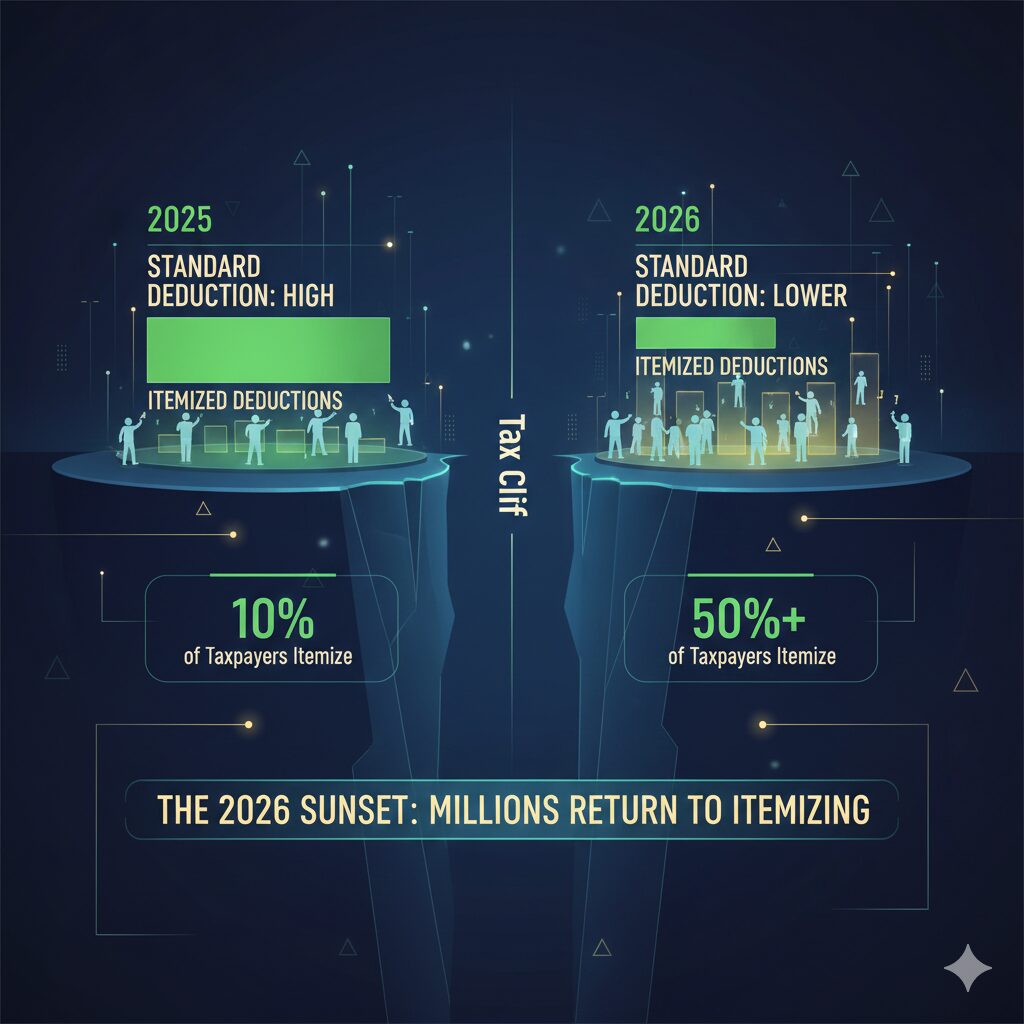 For the past several years, the standard deduction has been at historic highs, which led many taxpayers to stop itemizing. However, on December 31, 2025, many of the provisions that defined the current tax era are scheduled to expire. This “sunset” means that without new legislation from Congress, the tax code will revert to older models, significantly altering how much donors can deduct from their taxable income.