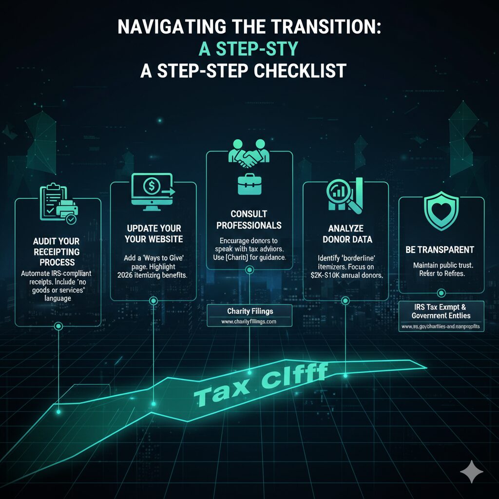 To ensure your organization is ready for the changes to charitable tax deductions 2026, follow this roadmap: